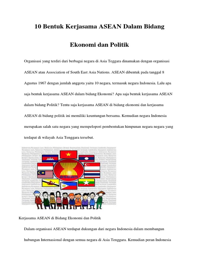 Demikian soal kerjasama asean dan peran indonesia. Mengirim pasukan perdamaian kontingan garuda Peran indonesia di bidang sosial dan budaya; Saat deklarasi bangkok di thailand, indonesia mengutus menteri luar negeri, yaitu adam malik sebagai perwakilan. Berikut ini tujuan kerja sama indonesia dalam bidang politik :
